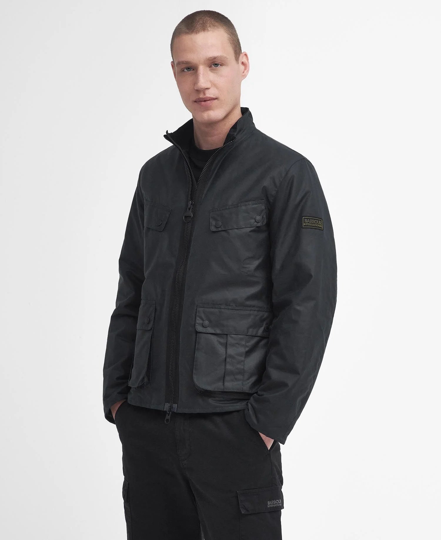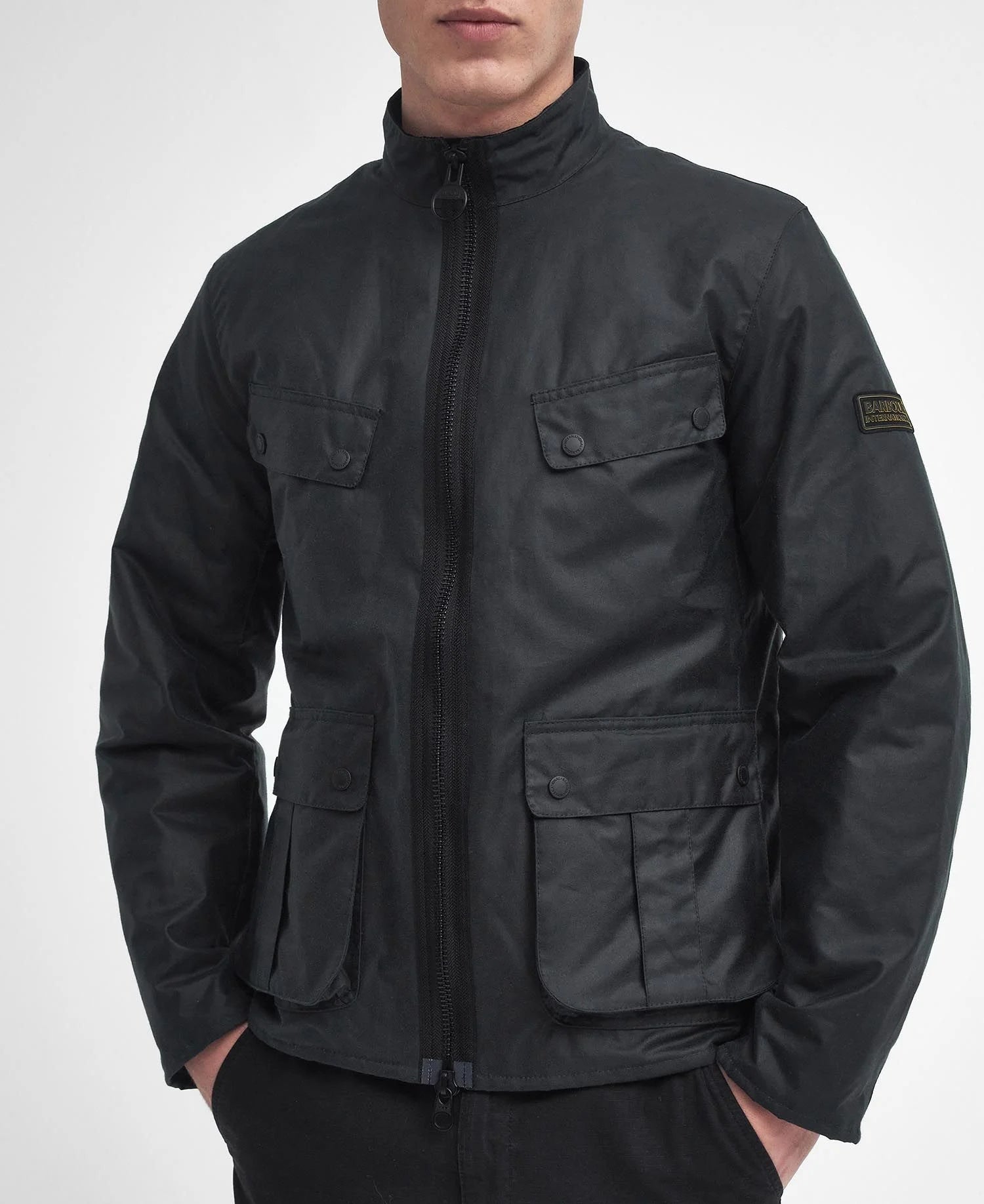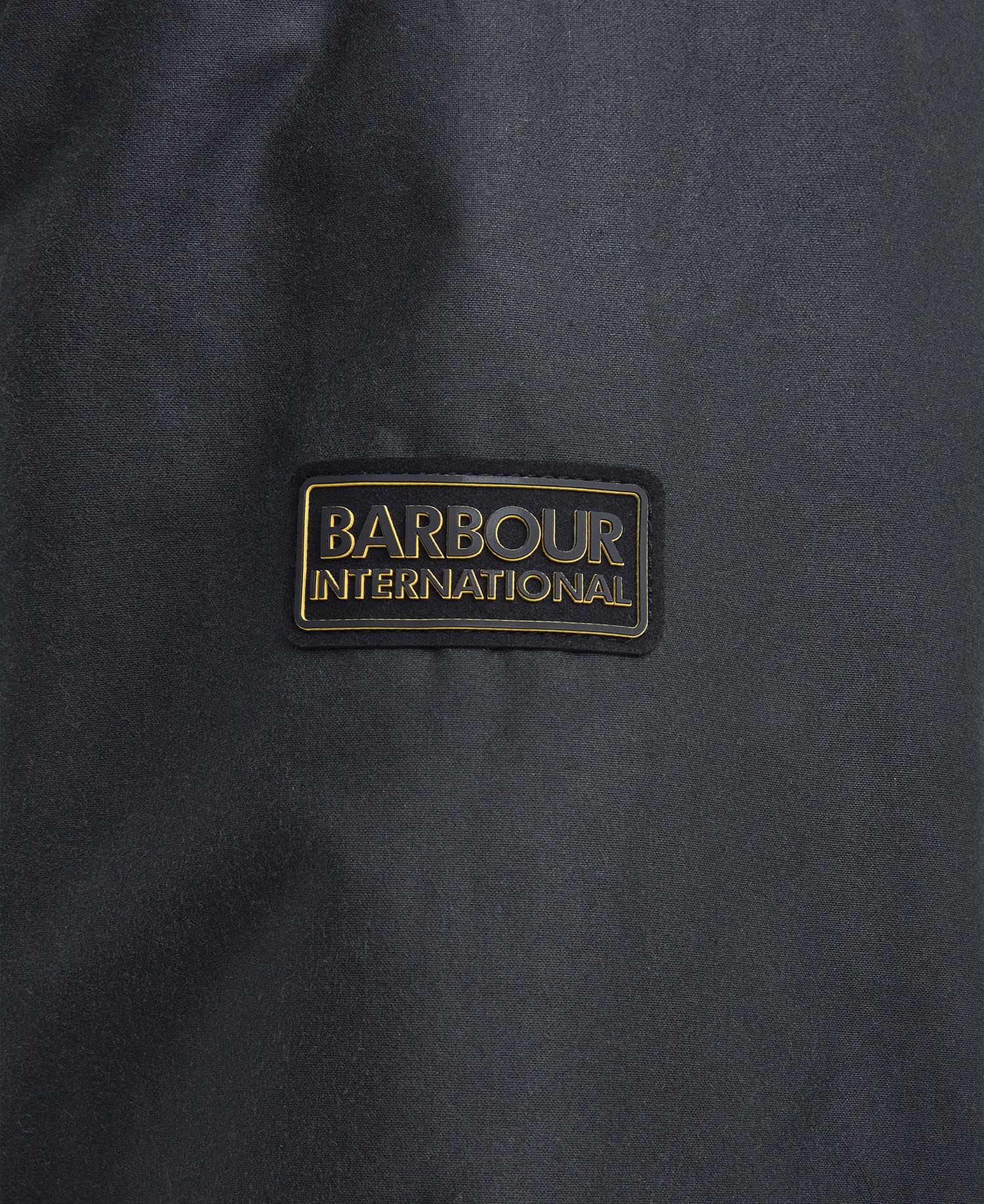 • Badge Barbour International nero e giallo in rilievo sulla manica sinistra.