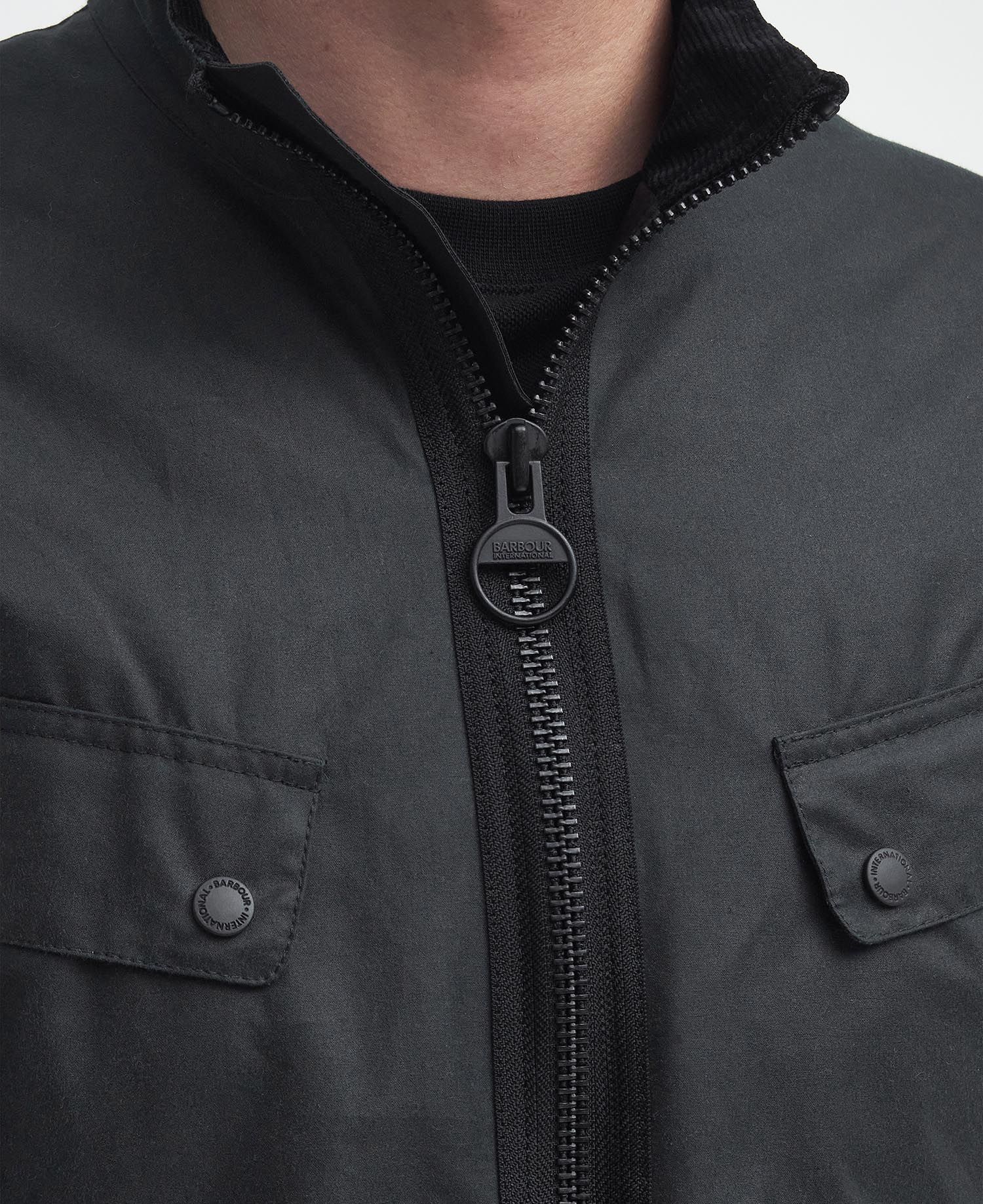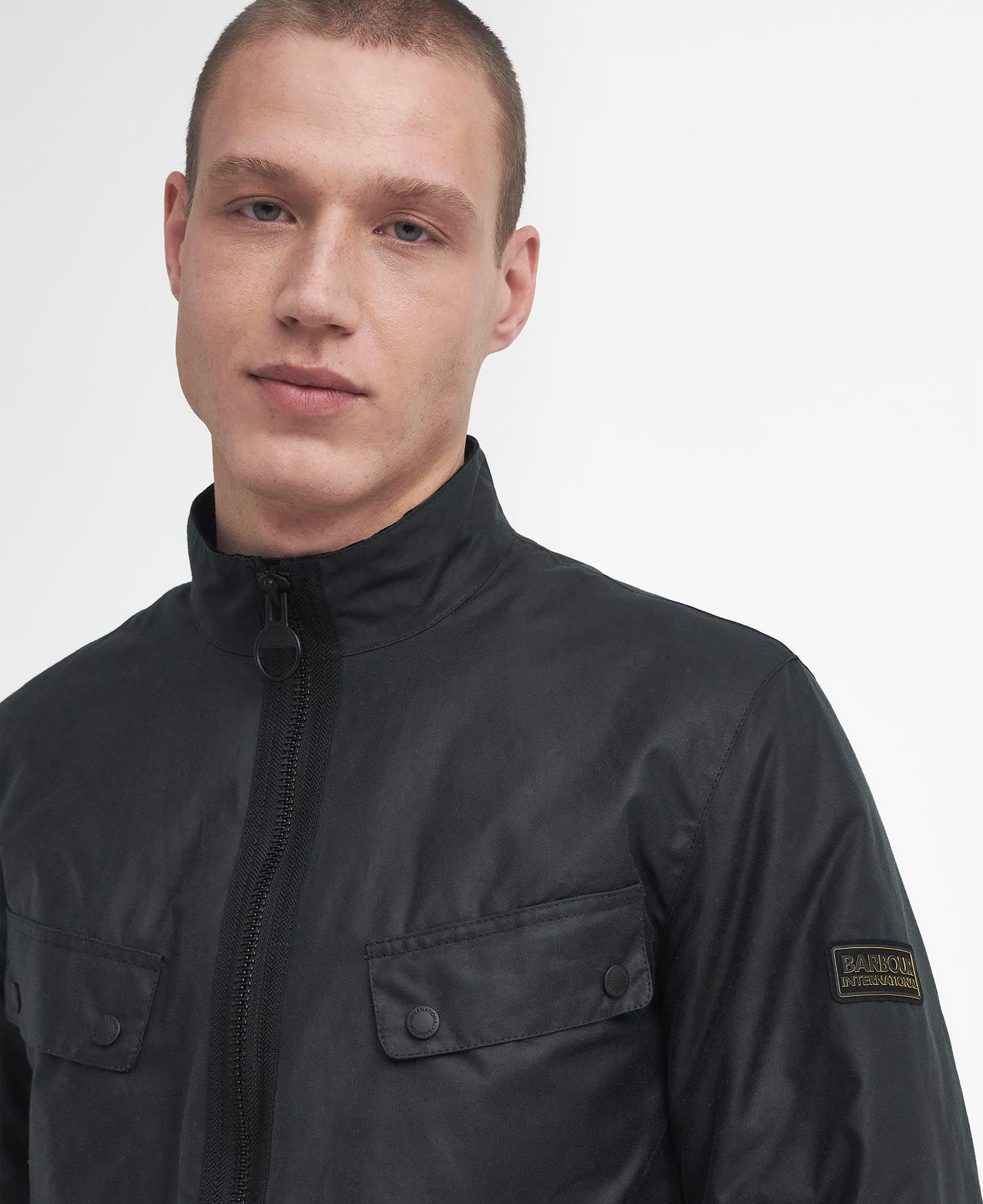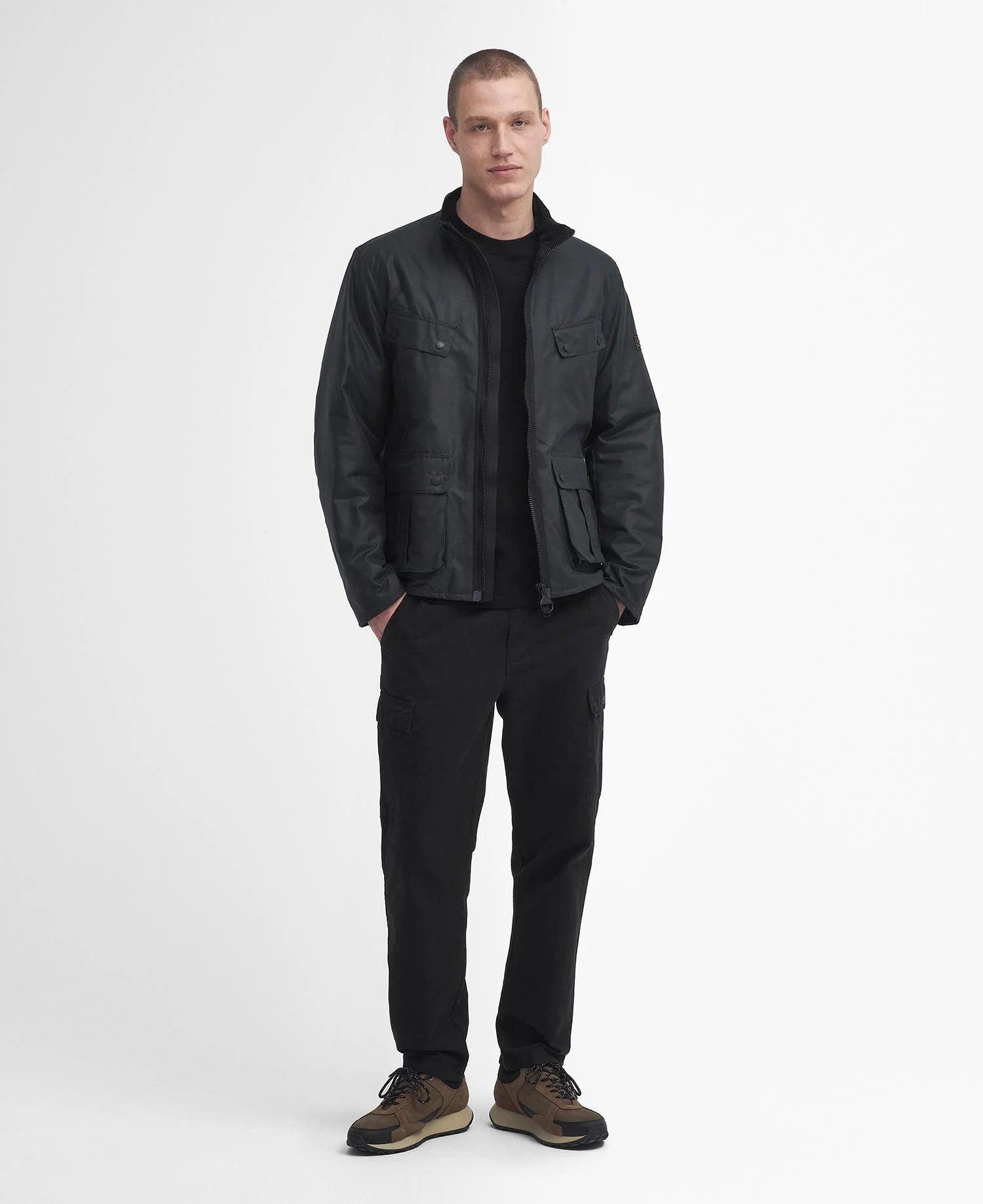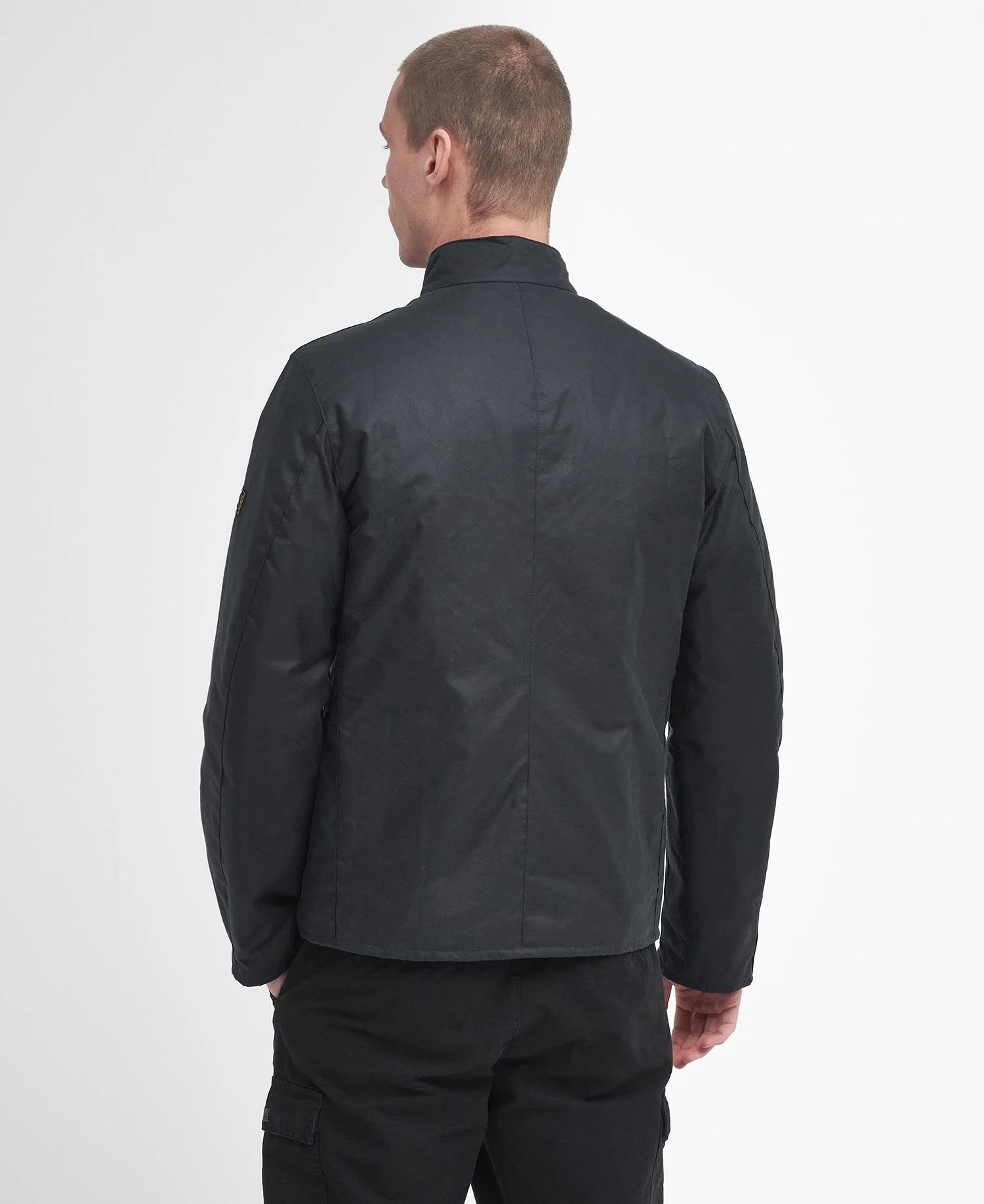 • Badge Barbour International nero e giallo in rilievo sulla manica sinistra.