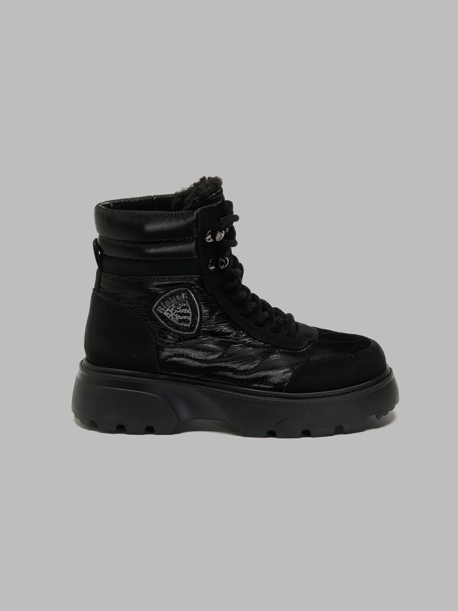 Scarponcino ispirato alle pedule da montagna, in tessuto satin e dettagli fashion, con iconico scudetto applicato sulla parte laterale. Confort garantito grazie alla forma ampia e al fondo scolpito oversize. Calda fodera con effetto pelliccia, soletto interno anatomico in pelle. Altezza suola zona tallone mm 35 e avampiede mm 20.