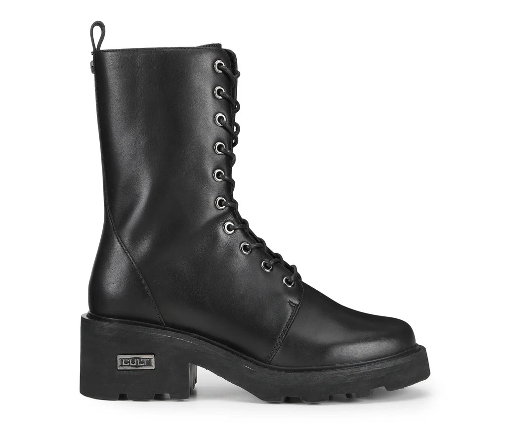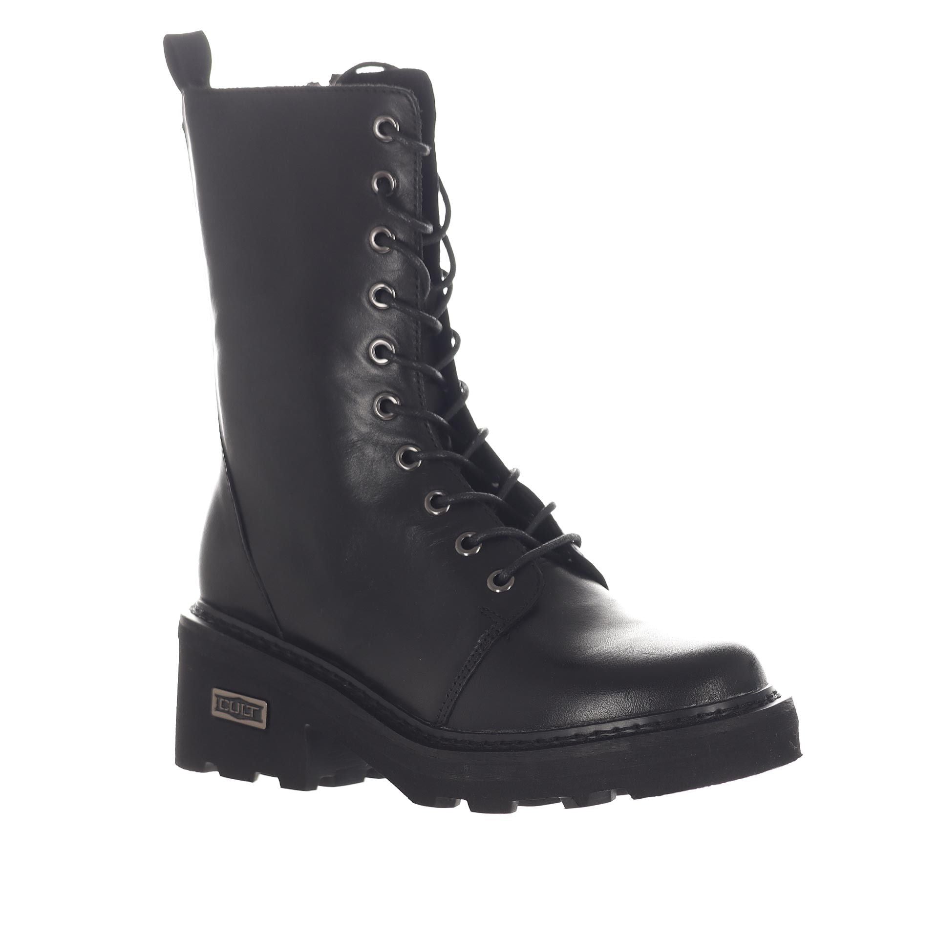 Comodi ma senza rinunciare all'anima rock gli anfibi stringati firmati da Cult per questo inverno. Un modello intramontabile di stivaletti in pelle con occhielli in metallo, targhetta con logo sulla suola di gomma e linguetta posteriore. Da indossare con jeans, pantaloni o gonne corte. Altezza tacco 5 cm.