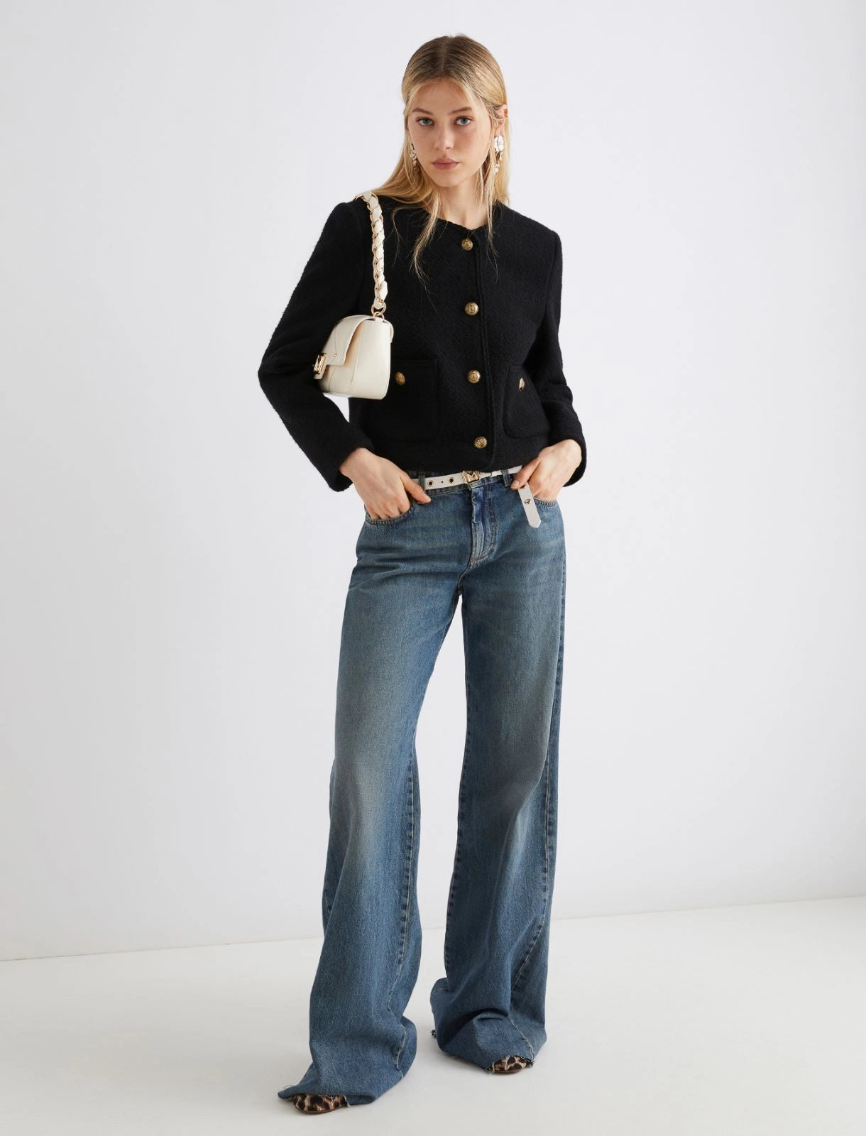 Interprete della nuova eleganza urbana, la giacca in bouclé fonde elementi iconici della femminilità con la leggerezza del taglio boxy. Indossala con pochette e denim, sarai perfetta sempre.