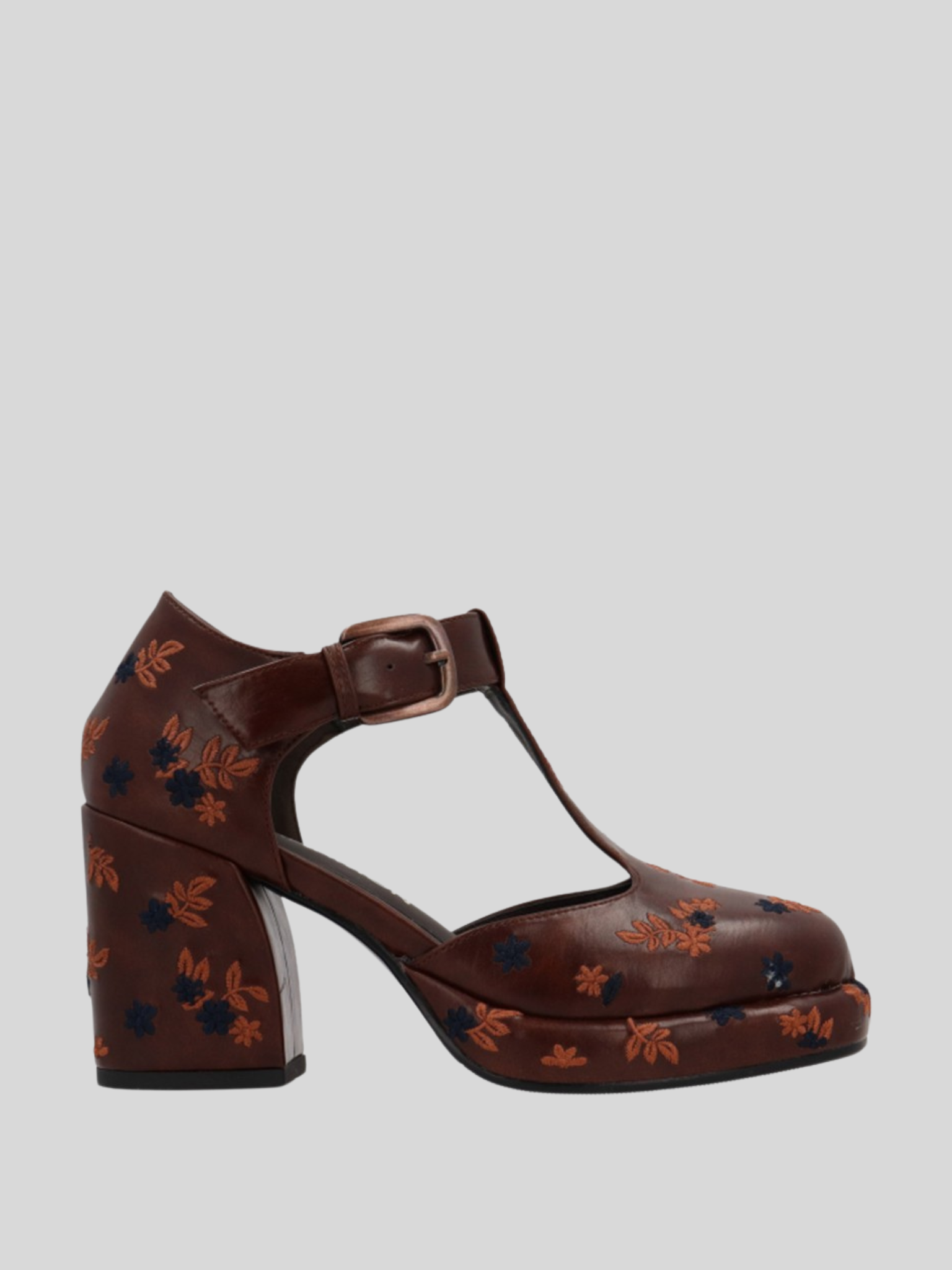 - Dettagli: tacco largo, plateau anteriore, cinturino a T con fibbia regolabile