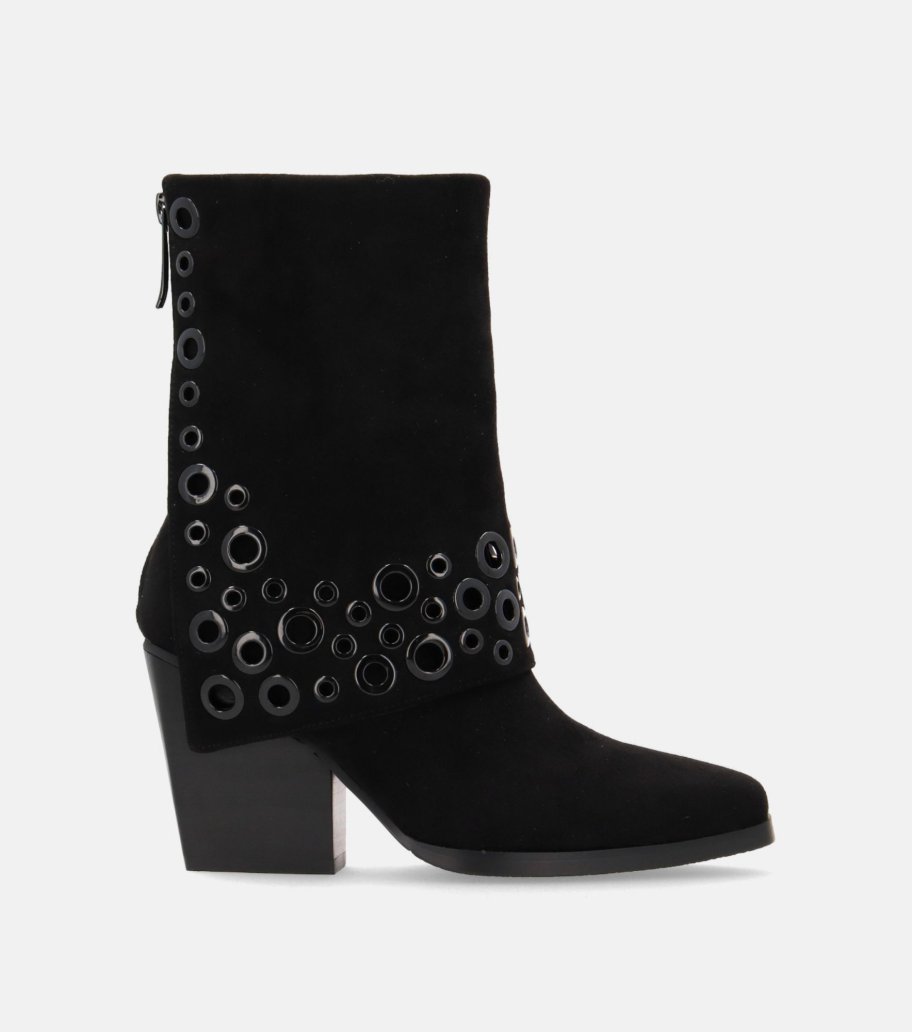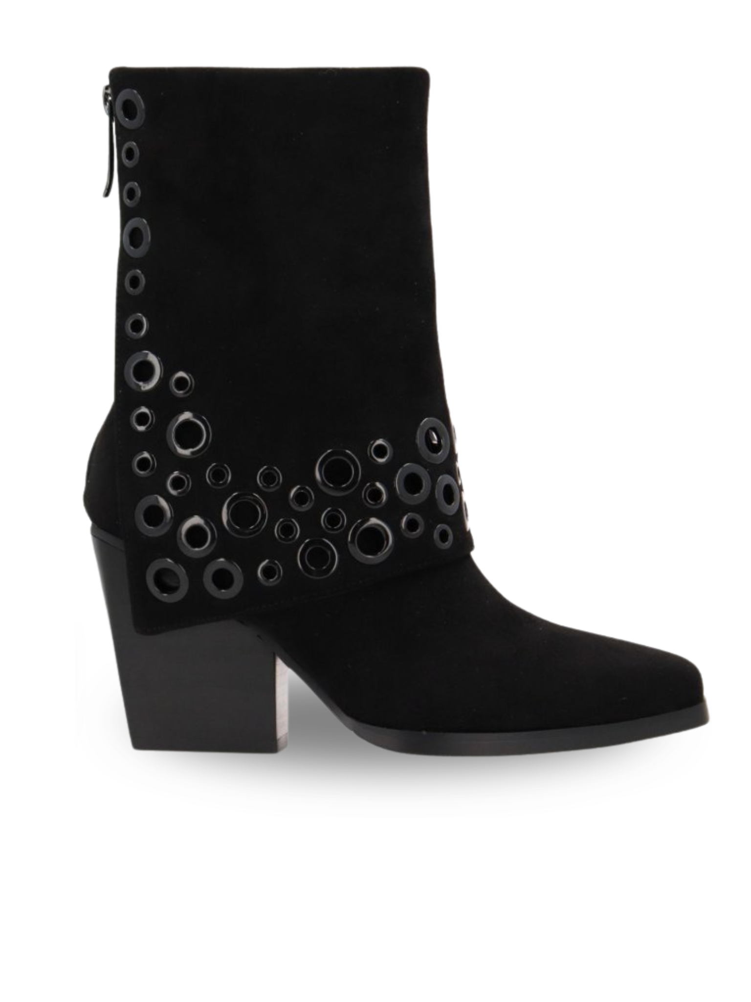 Realizzato in camoscio sintetico nero, lo stivale presenta maxi occhielli decorativi che aggiungono un tocco distintivo e di tendenza. La chiusura posteriore con zip garantisce praticità e facilità di calzata, mentre il tacco largo di 7 cm e la suola antiscivolo assicurano comfort e stabilità ad ogni passo. Ideale da abbinare a pantaloni, gonne o abiti, lo Stivale Elastico Noa Harmon è la scelta perfetta per chi desidera un look elegante e deciso durante la stagione Autunno-Inverno.