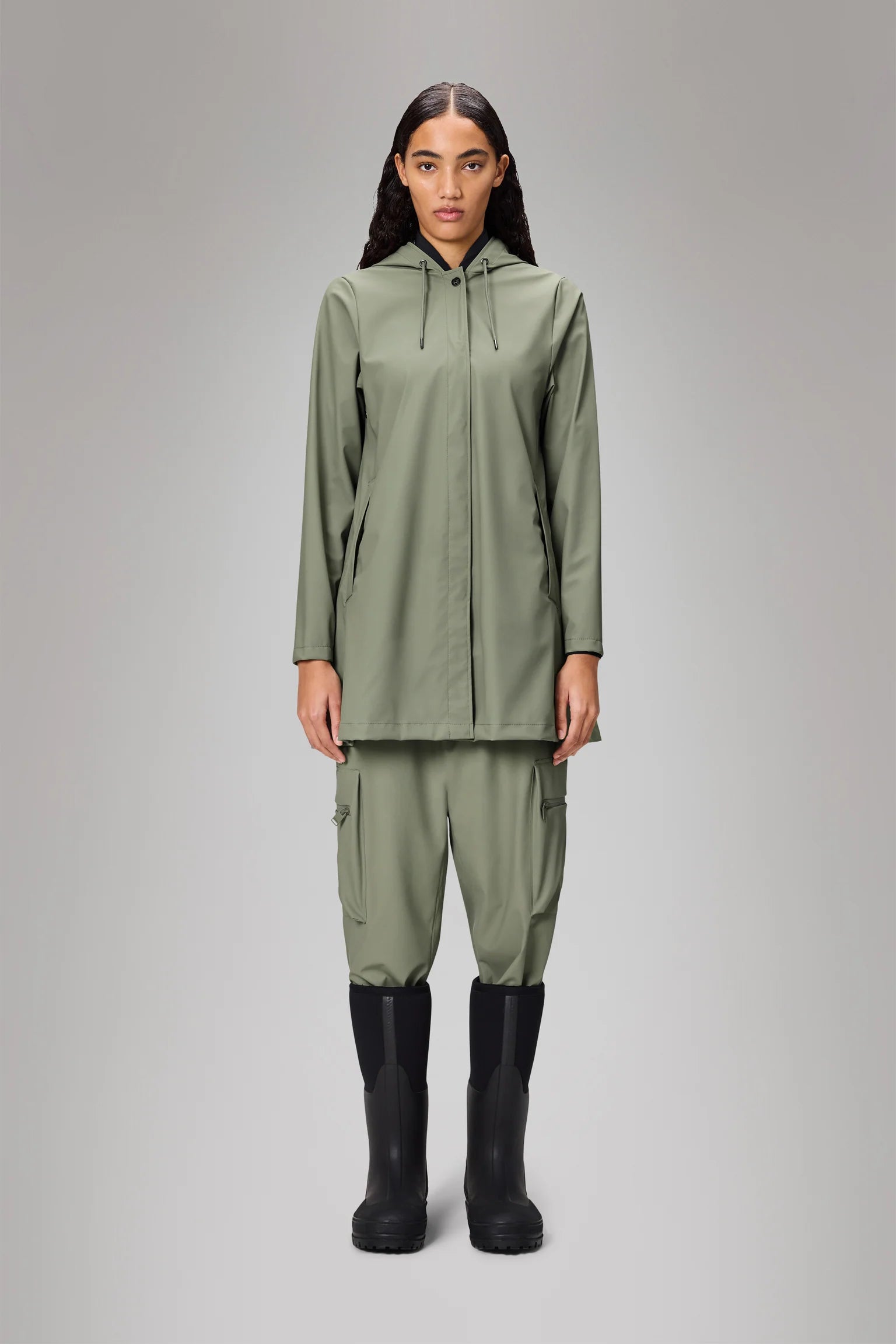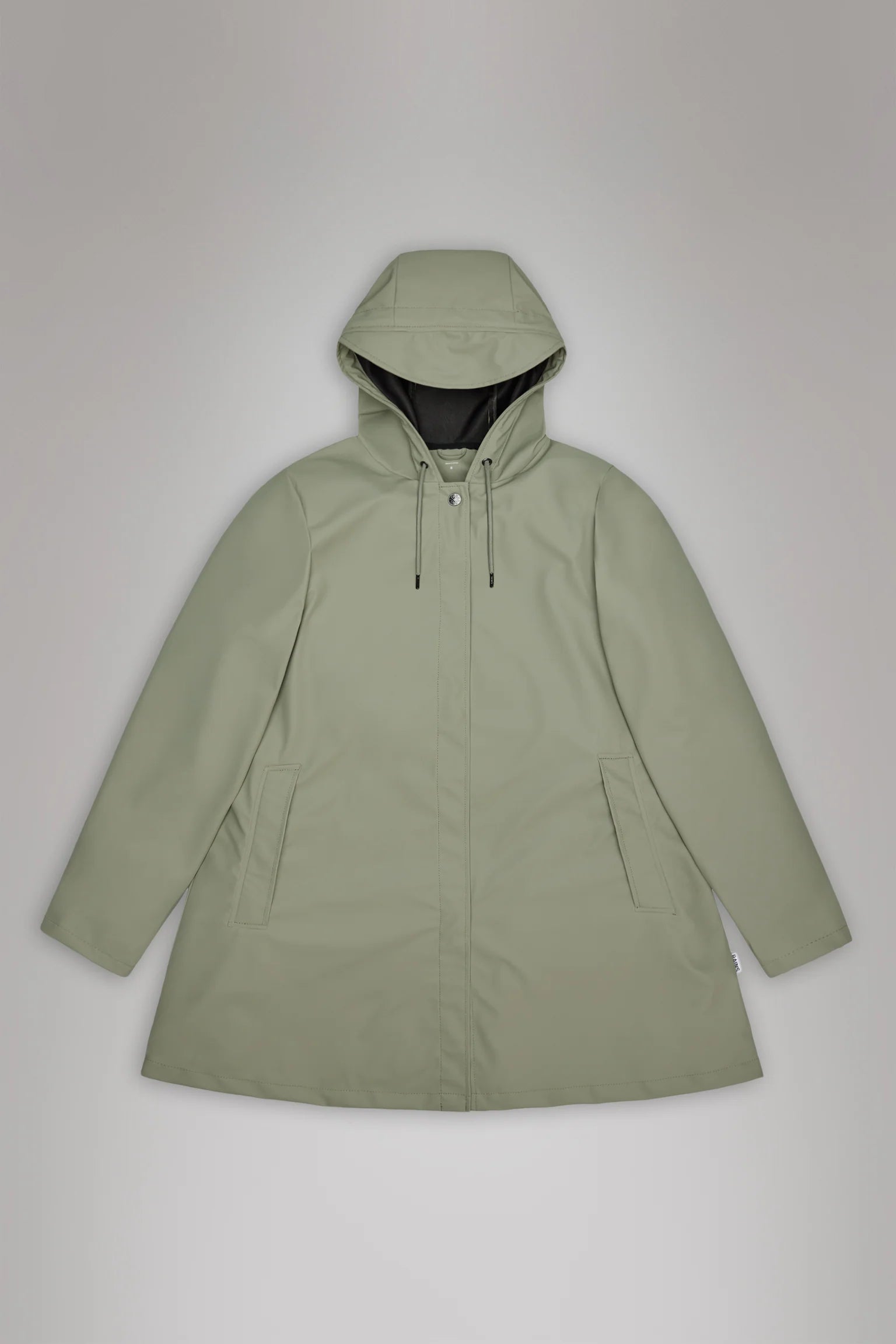 La giacca antipioggia è completata da bottoni automatici nascosti e da una patta di chiusura frontale. La A-Line W Jacket è realizzata nell'iconico tessuto PU di Rains e presenta cuciture nastrate, che rendono la giacca resistente all'acqua e al vento. Il finish è leggero, morbido al tocco