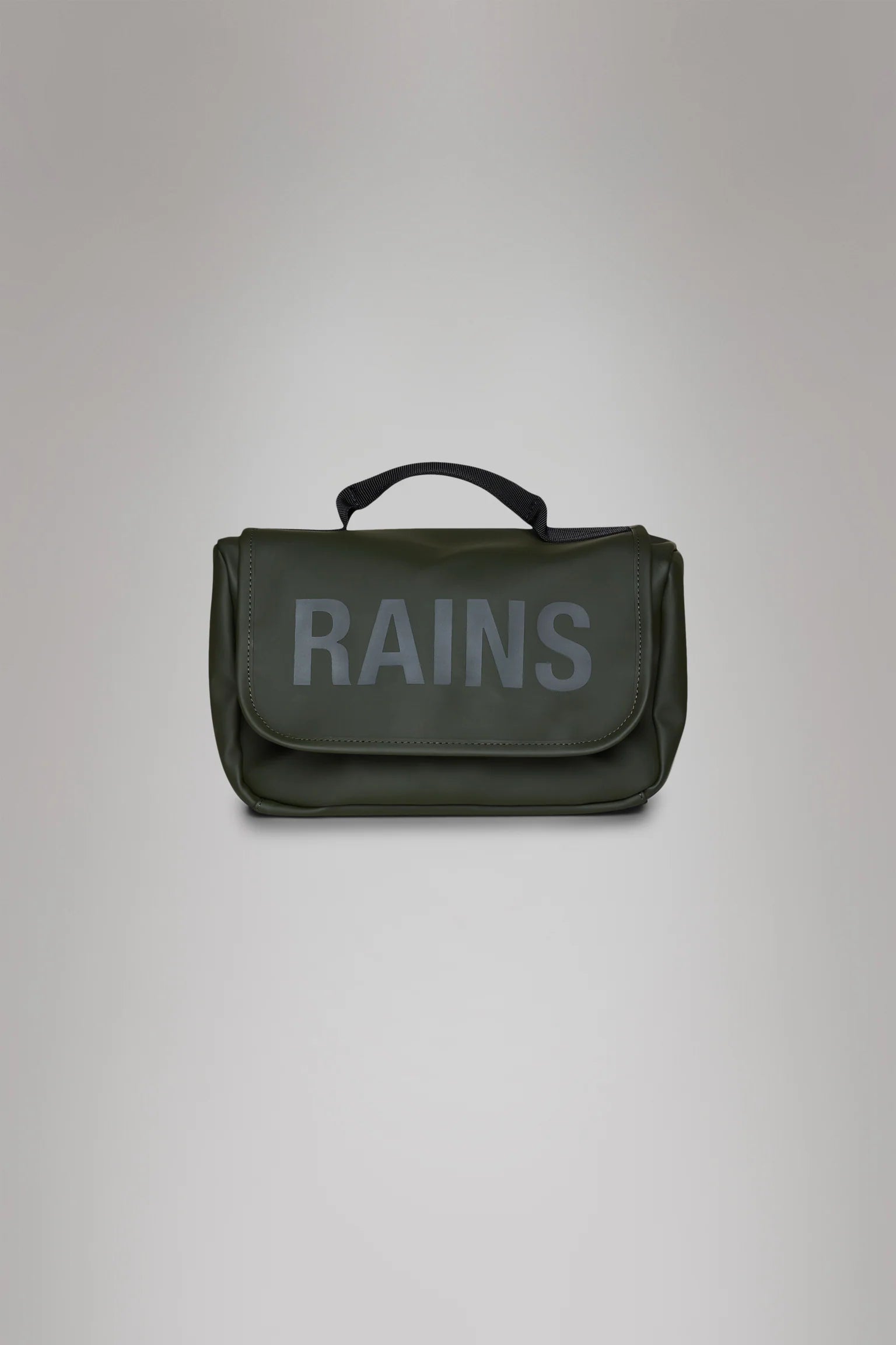 Texel Wash Bag è realizzata in tessuto PU impermeabile firmato Rains, progettato per essere robusto, duraturo e piacevole al tatto.